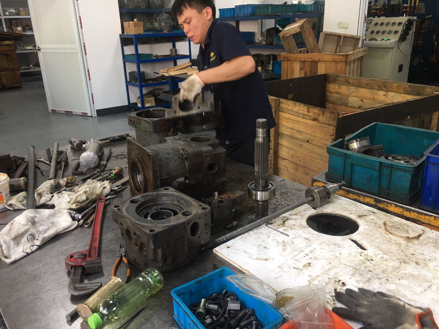 是往復(fù)泵的一種,屬于體積泵,其柱塞靠泵軸的偏心轉(zhuǎn)動驅(qū)動,往復(fù)運動,其吸入和排出閥都是單向閥。當(dāng)柱塞外拉時,工作室內(nèi)壓力降低,出口閥關(guān)閉,低于進(jìn)口壓力時,進(jìn)口閥打開,液體進(jìn)入;柱塞內(nèi)推時,工作室壓力升高,進(jìn)口閥關(guān)閉,高于出口壓力時,出口閥打開,液體排出。帶滑靴結(jié)構(gòu)的軸向柱塞泵是使用*廣泛的軸向柱塞泵,安放在缸體中的柱塞通過滑靴與斜盤相接觸,當(dāng)傳動軸帶動缸體旋轉(zhuǎn)時,斜盤將柱塞從缸體中拉出或推回,完成吸排油過程。柱塞與缸孔組成的工作容腔中的油液通過配油盤分別與泵的吸、排油腔相通。變量機(jī)構(gòu)用來改變斜盤的傾角,通過調(diào)節(jié)斜盤的傾角可改變泵的排量。
